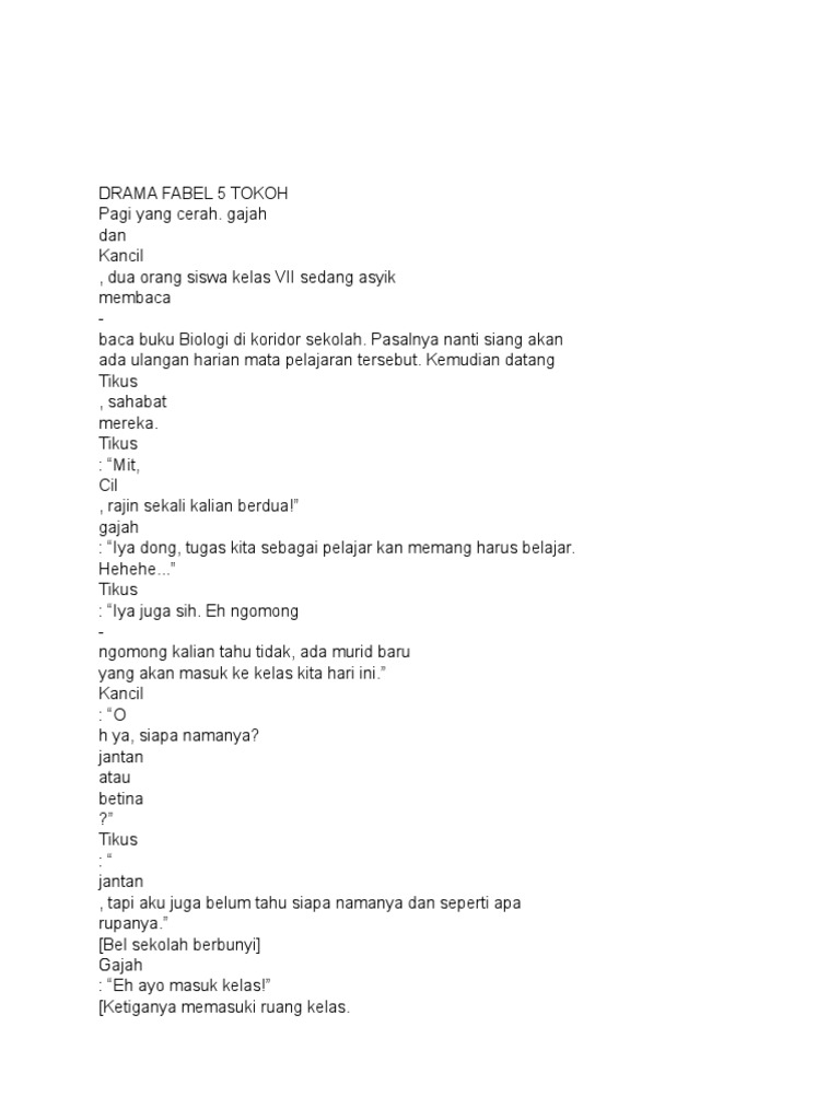Contoh drama fabel 5 orange contoh drama fabel 5 oranges contoh drama fabel 5 orang terkaya contoh drama fabel 5 orang indonesia contoh drama fabel 5 orang yang contoh drama fabel 5 orange reflective snow markers contoh drama fabel 5 orang contoh drama fabel 5 tokoh contoh drama fabel 4 orang contoh naskah drama. Sebagai contoh domba yang mempunyai bulu-bulu yang halus dan mempunyai penggambaran karakter yang lembut kalem halus ramah dan menawan contoh lain tokoh yang digambarkan oleh buaya yang sesuai dengan watak aslinya yaitu rakus dan buas serta kancil yang dikenal dengan karakter cerdik. Contoh Drama Fabel 5 Orang.