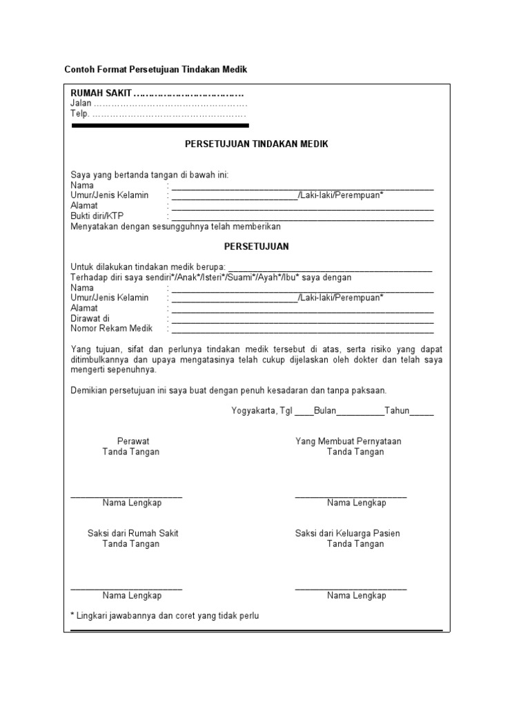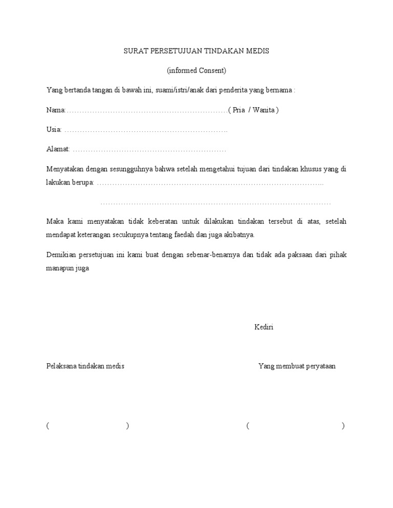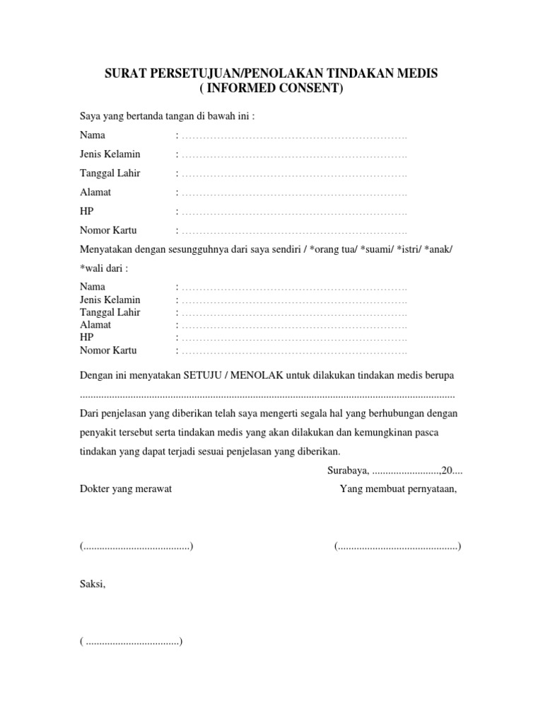 Tindakan medik adalah suatu tindakan. Informed consent merupakan suatu prosedur persetujuan tindakan medis yang diberikan pasien kepada dokter. Format Penolakan Tindakan Medis.